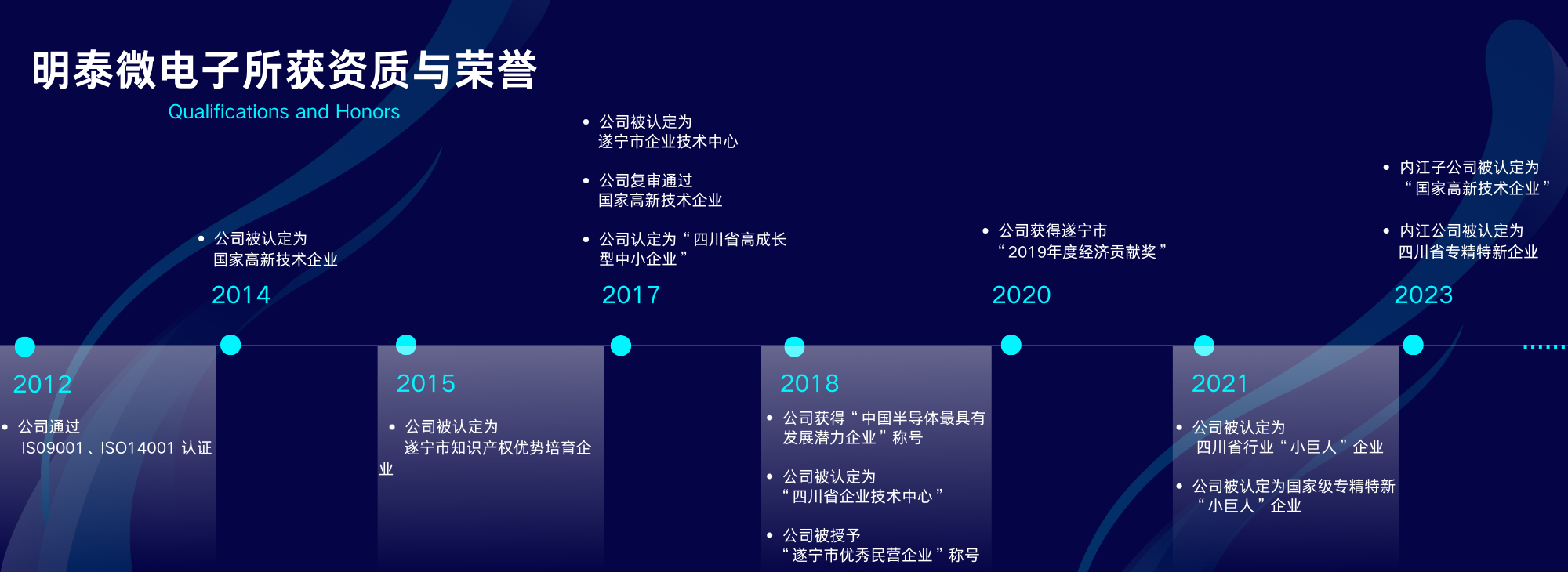 四川明泰電子科技有限公司獲得的資質和榮譽 ?2012年,公司通過ISO9001和ISO14001認證; 2014年,公司認定為“國家高新技術企業”; 2015年,公司認定為“遂寧市知識產權優(yōu)勢培育企業”;
